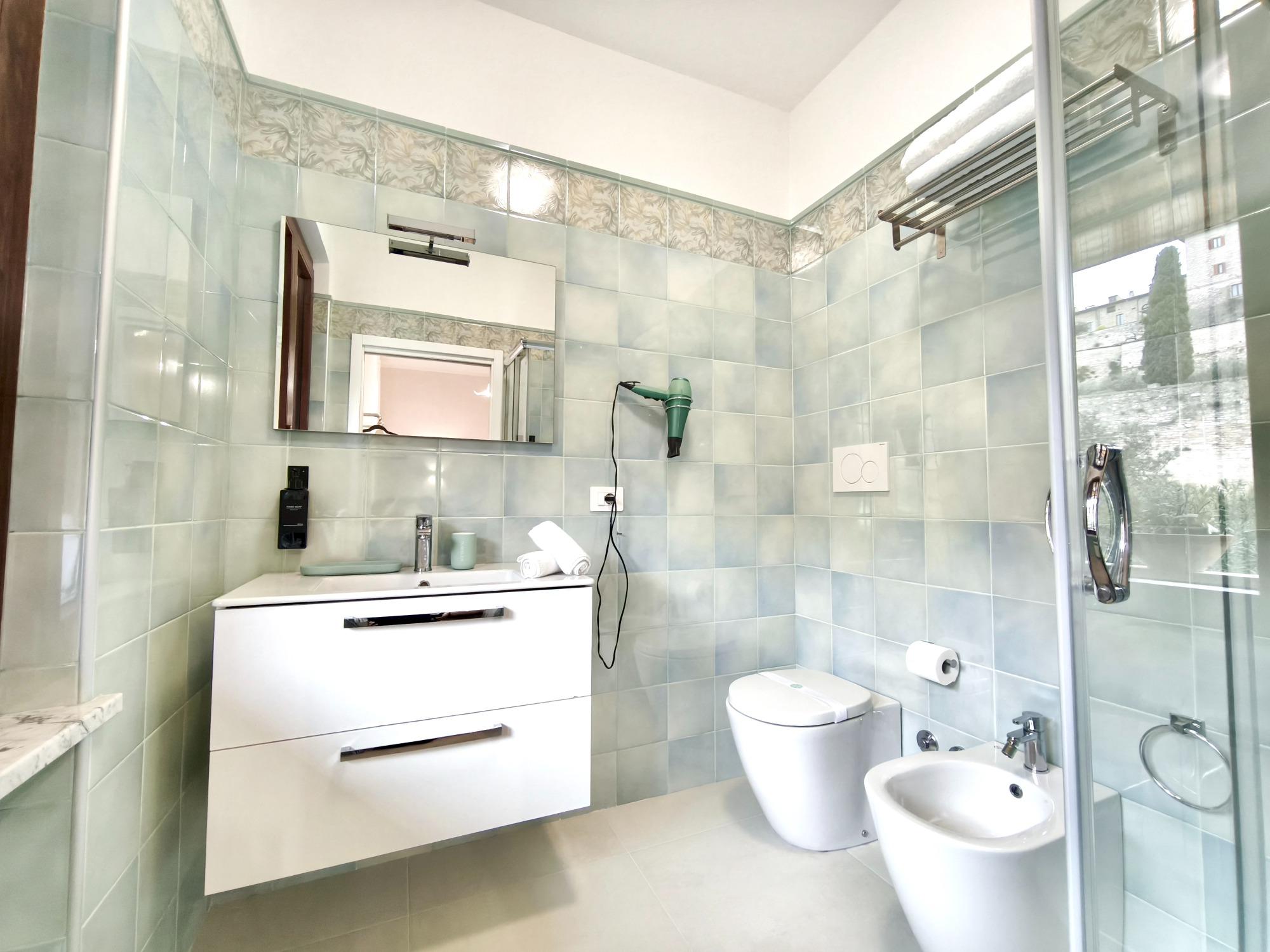 Camera matrimoniale con bagno con balcone vista sulla piscina e sul paese di Spello.